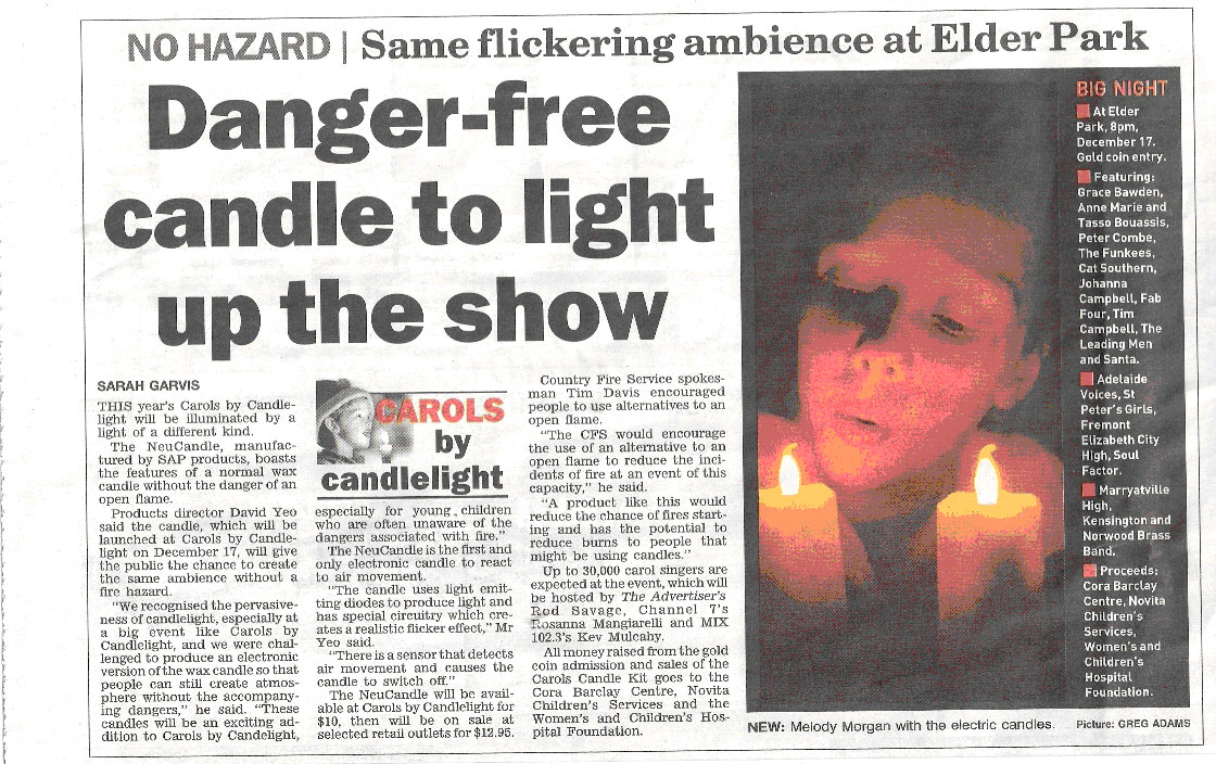 SAP Products Australia is privileged to support Carols By Candlelight SA with one of our patented Products, the NeuCandle Electronic wind sensitive candle. For a 12 month period starting from 17th of December 2006, we will donate part of our proceeds from wholesaling the NeuCandle thoughout Australia for the benefit of the Women’s and Children’s Hospital Foundation, Cora Barklay Centre and Novita Children’s services. |